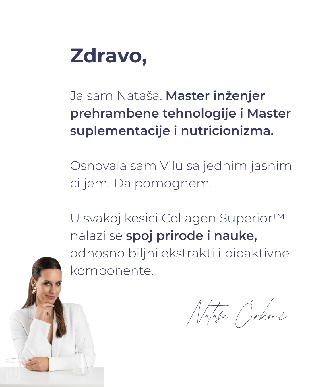 - Kao Master suplementacije i ishrane i Master inženjer prehrambene tehnologije birala sam da svaki sastojak u Collagen Superior™ proizvodu bude najvišeg kvaliteta. Vodila sam se rečenicom, samo od kvalitetnih sastojaka možeš napraviti kvalitetan proizvod.