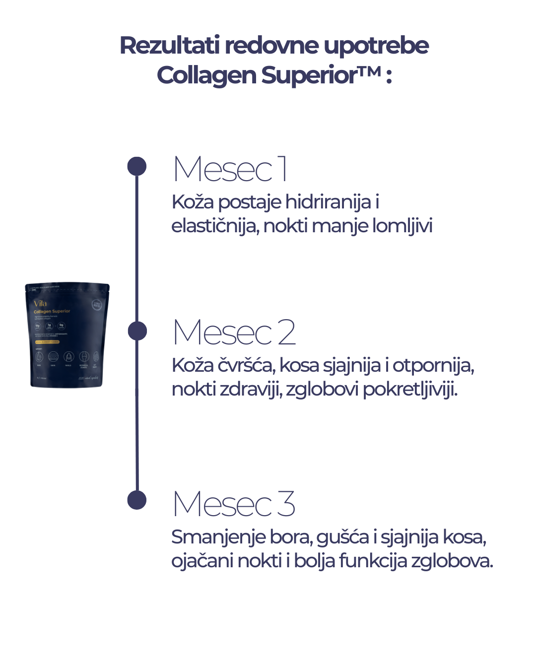 Collagen Superior povećava elastičnost i hidrataciju kože, jača kosu, vraća joj sjaj i volumen i štiti je od opadanja, obnavlja hrskavicu, kosti, kožu, zube, nokte i krvne sudove.